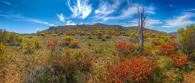 About 200km south, the 540 million-year-old Flinders Ranges is also experiencing a bumper season. The region is known for its rugged red ranges, gnarled gum trees and stony creek beds.